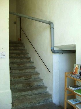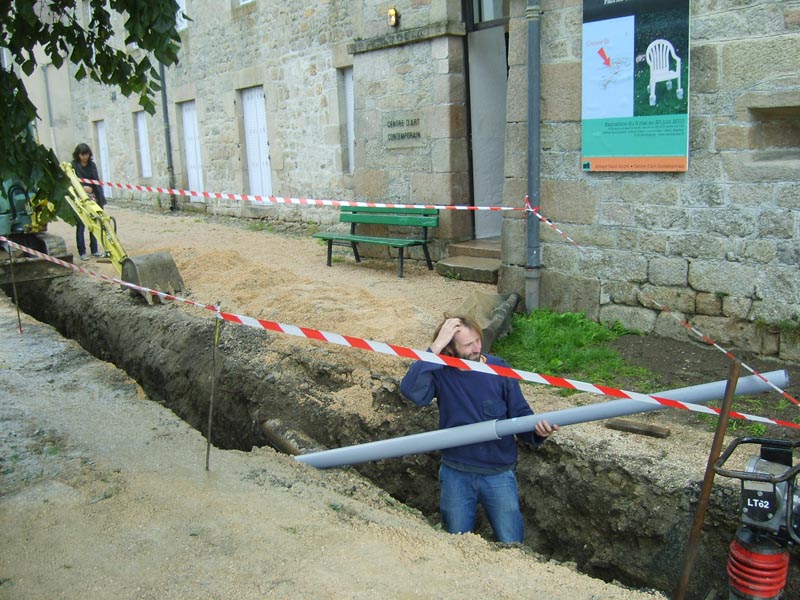 Les gouttières visibles par les fenêtres de l'étage laissent échapper quelques gouttes, un filet d'eau qui, capté par des tubes, emplit lentement des bacs en plastique. Arrivé au niveau déterminé par les contre-poids, les bacs basculent, envoyant dans le réseau d'évacuation en PVC une vingtaine de litres d'eau. Les vingt litres, accélérés par la gravité excitent 2 turbines réparties au rez-de-chaussée-haut et au premier étage du centre d'art l'abbaye Saint-André. Ces générateurs électriques produisent de manière discontinue une tension de 12V sous un courant aux alentours de 10 milliampères. Ces quelques milliampères, eux insensibles à la gravité, sont remontés au second étage par 2 fils de cuivres gainés, et rechargent lentement une batterie composée de 10 accumulateurs au nickel et cadmium d'une tension individuelle de 1,2 volts et d'une puissance de 2650 milliampères/heure.